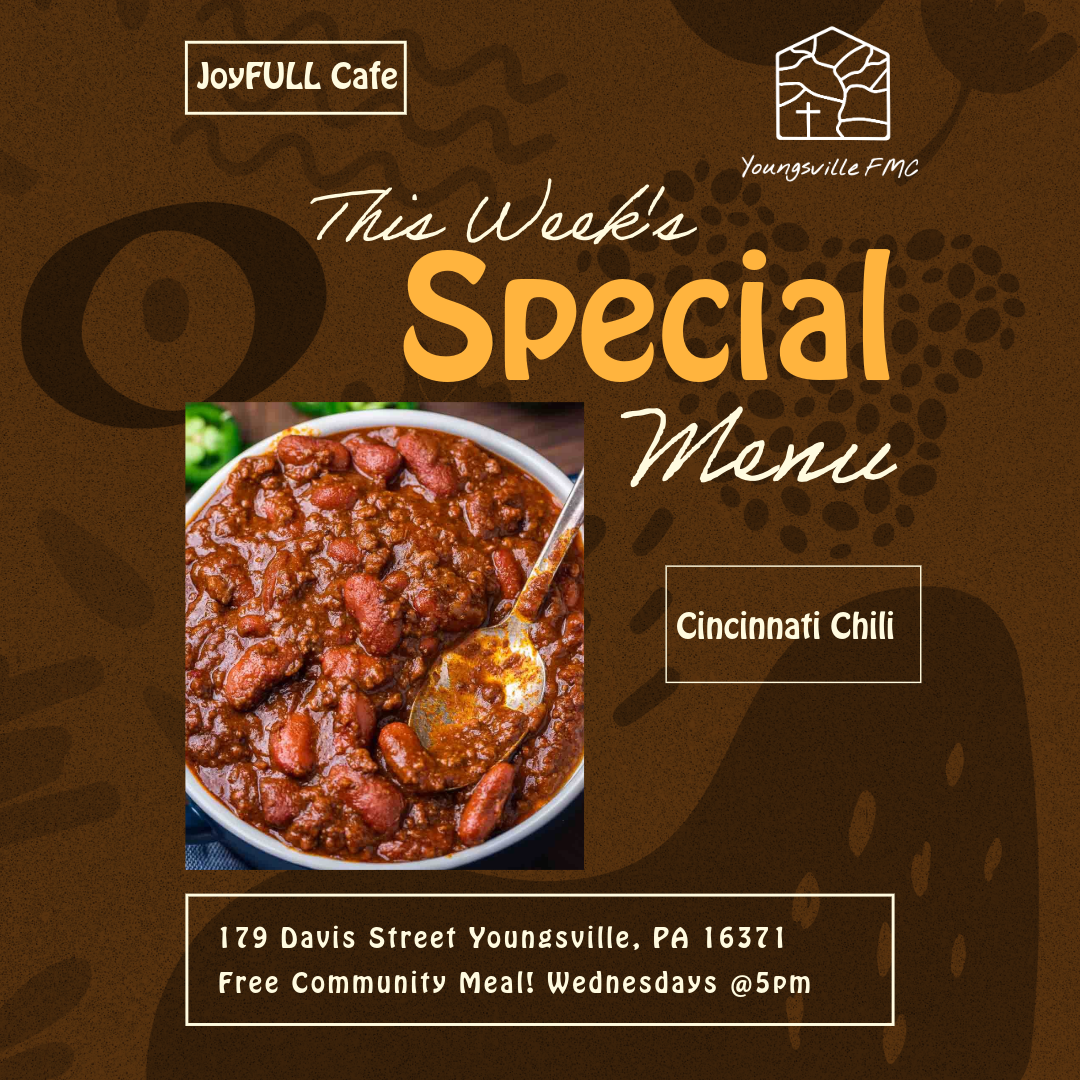 This week's menu will be Cincinnati Chili! Come join us every Wednesday @5pm in the social hall!   Con ...