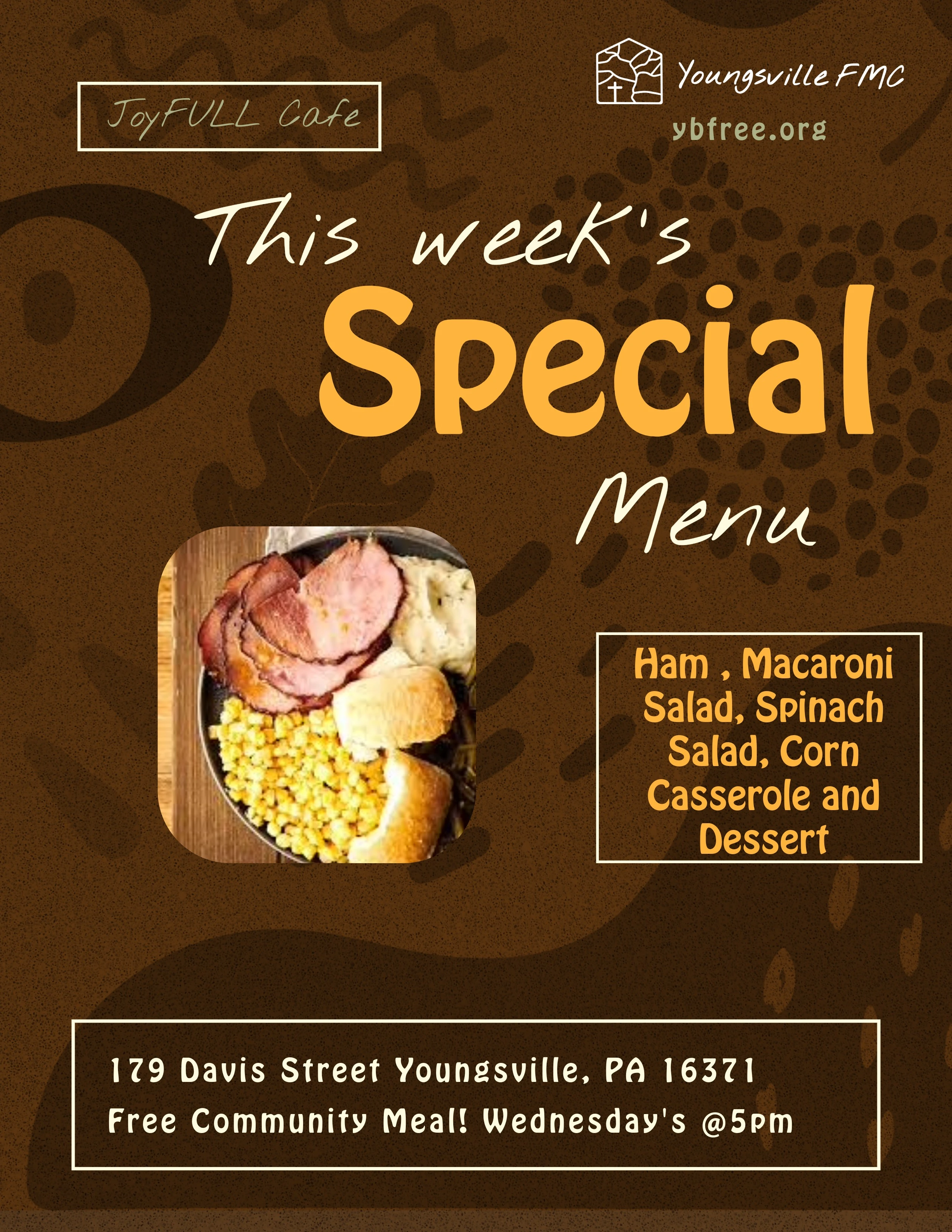 This week's menu will be Ham, Macaroni Salad, Spinach Salad, Corn Casserole, and dessert! Come join us every ...